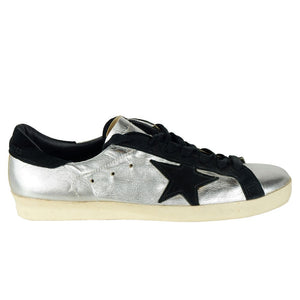 Golden Goose low sneakers in silver painted calfskin, upper edges and star logo in black suede, rubber sole with worn effect