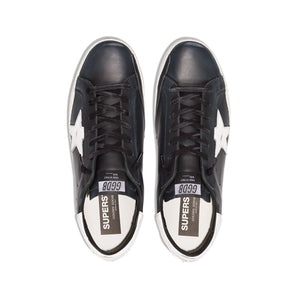 Black, round toe, front lacing, logo patch on the tongue, branded insole, signature star patch to the sides, contrasting branded heel counter, antiqued finish, flat rubber sole. Super-Star leather sneakers Size and Fit - Heel 1,4 in / 3,5 cm; Platform 1 in / 2,5 cm