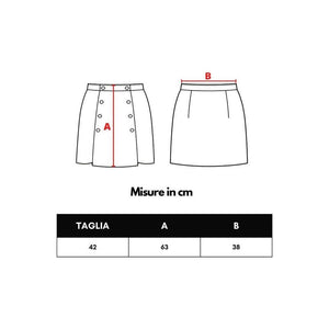 Side opening with gold hook and hidden zip, two side welt pockets, medium length. Gaucho skirt/pants model with symmetrical front/back slits.
