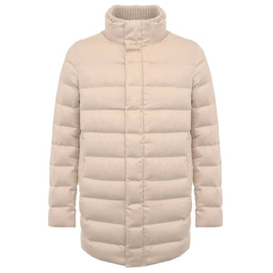 Elevate your wardrobe with the impeccable fusion of luxury and function present in the Herno cashmere and silk down jacket. Expertly crafted in Italy, this piece combines sumptuous materials with practical down filling, ensuring warmth and style. The zipper and button closure add a touch of classic elegance, while the polyester lining provides extra comfort. Adorned with a knitted embroidered inner collar, this jacket is a statement of refined sophistication.