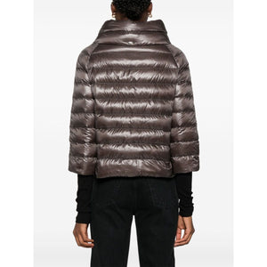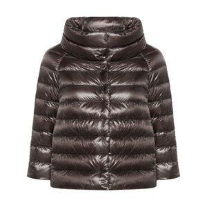 grey glossy finish goose down padded design funnel neck concealed front press-stud fastening three-quarter length sleeves two side slit pockets straight hem full lining Sofia nylon cape