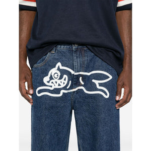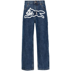 indigo blue cotton denim Running Dog graphic print to the front logo patch to the rear belt loops front button and zip fastening straight leg classic five pockets straight hem Running Dog denim jeans