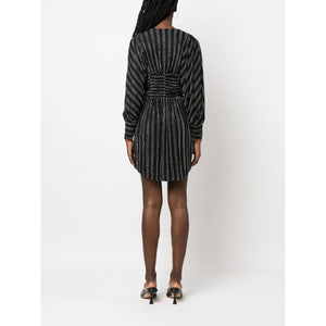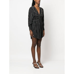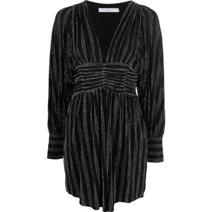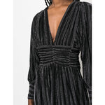 mettalic-ribbed long-sleeves dress from IRO featuring black, silver-tone, metallic effect, vertical stripe pattern, textured finish, plunging V-neck, gathering at the hip, long sleeves and fitted-cuff sleeves. Gaida short viscose dress Size and Fit - This piece fits true to size. We recommend you get your regular size. Model is 1,75m / 5ft 8in wearing size 36 (FR)