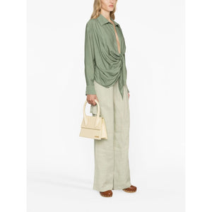 Le Grand Chiquito tote bag from Jacquemus featuring ivory white, calf leather, gold-tone logo plaque, single rolled top handle, foldover top with magnetic fastening, adjustable detachable shoulder strap and main compartment. Le Grand Chiquito leather handbag Size and Fit - Width 9,06 in / 23 cm Height 6,3 in / 16 cm Depth 3,54 in / 9 cm Handle 5,91 in / 15 cm Strap 20,08 in / 51 cm