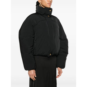 black crinkled finish J locker loop gold-tone logo-engraved buttons padded design funnel neck front press-stud and zip fastening long sleeves elasticated cuffs two side slit pockets elasticated hem cropped full lining La Doudoune Courte Caraco down jacket Size and Fit - This piece fits true to size. We recommend you get your regular size. Model is 1,75m / 5ft 8in wearing size 36 (FR)