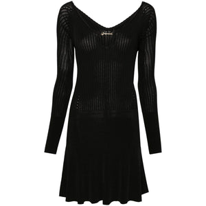 black ribbed knit gold-tone logo plaque wide neck long sleeves elasticated cuffs flared skirt scallop hem thigh-length La Mini Robe Pralu dress Size and Fit - This piece fits true to size. We recommend you get your regular size. Model is 1,75m / 5ft 8in wearing size 36 (FR)
