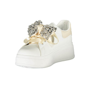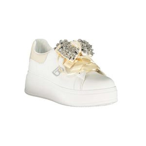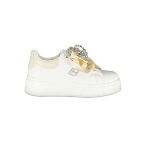 Unleash your elegance with every step in these Laura Biagiotti sneakers. Meticulously crafted, they blend the comfort of sports footwear with a dash of opulence. The crisp white palette is accented with contrasting details, making a bold statement. Embellished with removable rhinestones, these sneakers afford a touch of customizable glam, while the insole ensures ultimate comfort, easily removed for your convenience. The subtle 4 cm wedge heel adds just the right lift. Dare to stand out with Laura Biagiotti’s emblem of craftsmanship and style.