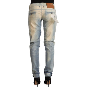 ارتقي بمجموعة الدنيم الخاصة بك مع هذا الجينز الضيق الرائع باللون الأزرق الفاتح من Acht. مصنوع من مزيج فاخر من 98% قطن و2% إيلاستين، هذا الجينز يوفر مزيجًا من الراحة والأناقة. مصمم بخصر منخفض جذاب وصورة ظلية انسيابية، ويتميز بسحاب كلاسيكي وأزرار للإغلاق لملاءمة آمنة. يُعد هذا البنطلون، المُفصل بلمسات الشعار الدقيقة، شهادة على الأناقة والفخامة الخالدة.