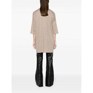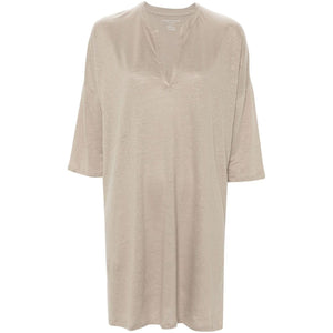 medium beige linen blend stretch-design slub texture V-neck three-quarter length sleeves side slits straight hem This item contains at least 50% materials which are certified or widely recognised as having a lower environmental impact through production and/or manufacturing processes that reduce water consumption and the use of harmful chemicals, or re-use by-products of the production process. Learn more about what makes a product Conscious on our Conscious Criteria page Linen blend tunic dress Size and Fit - This piece fits true to size. We recommend you get your regular size. Model is 1,75m / 5ft 8in wearing size 1 (NUM)