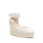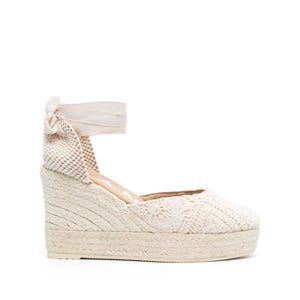 light beige crochet round toe branded leather insole 100mm braided raffia wedge heel rubber outsole tie-fastening ankle strap Yucatán crochet cotton wedge espadrilles Size and Fit - Heel 3,7 in / 9,5 cm Platform 1,2 in / 3,05 cm