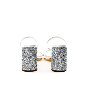 Miu Miu Mixed Silk Sandal with Crystals Heel. White, square toe, open front, silk micro strap on front, silk edged, glitter covered block heel. Composition: 100% Leather-Sku inside:24GIU42