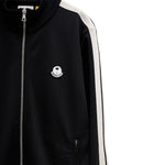 Elevate your wardrobe with the Moncler x Palm Angels collaborative masterpiece. This sweatshirt fuses high-fashion finesse with streetwear edge, showcased in its slick black hue accentuated by bold side stripes. Function meets design with a practical zipper closure, while the embossed logos celebrate the iconic partnership. The striking typography on the back adds an element of rebellious attitude. Crafted in RO, this piece is a testament to trendsetting craftsmanship.