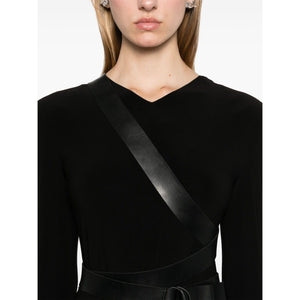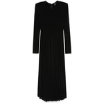 black stretch-jersey V-neck flared hem concealed rear zip fastening draped design shoulder pads long sleeves thumb slots detachable and adjustable waist belt fitted waistline unlined mid-calf length V neck flared dress