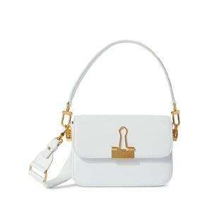small Binder shoulder bag from Off-White featuring white, leather, gold-tone hardware, adjustable detachable shoulder strap, signature Binder Clip fastening, foldover top with magnetic fastening, rear patch pocket and internal zip-fastening pocket. Binder small leather shoulder bag Size and Fit - Width 6,69 in / 17 cm