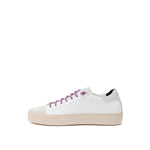 P448 White leather Thea sneaker, front lacing with fuchsia-colored lurex laces, ivory suede toe, on the tongue perforated logo, as well as on the side and back of the shoe. Rubber outsole, 3 cm. Composition: 100% Leather-Sku inside:24FEB03