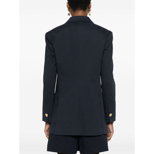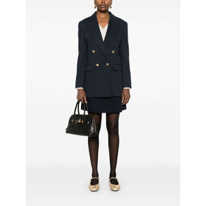 أزرق داكن بلمسة نهائية من نسيج محبوك، أزرار مزدوجة، ياقة مدببة، وسادات كتف، أكمام طويلة، جيب على الصدر، جيبان جانبيان، فتحات تهوية خلفية إنجليزية، بطانة كاملة، حاشية مستقيمة، المقاس والملاءمة - هذه القطعة تناسب المقاس الحقيقي. نوصيك بالحصول على مقاسك المعتاد. يبلغ طول الموديل 1.75 متر / 5 أقدام و8 بوصات، وترتدي المقاس S