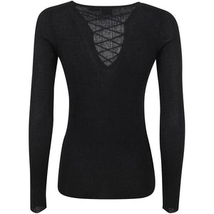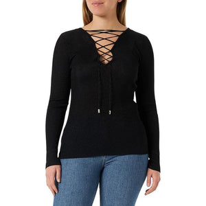Pinko ribbed sweater in metallic fiber, V-neck with crossed drawstring, tight fit