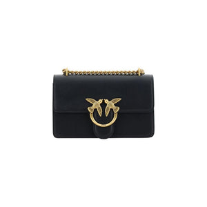 Calfskin Love One Mini Shoulder Bag by Pinko, featuring front flap closure with magnetic button, iconic gold-plated Love Birds logo embossed on front, dual interior compartment, sliding chain strap, iconic tone-on-tone embroidered brand monogram on back, adjustable and removable flat leather shoulder strap.
