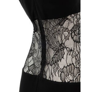 Rosemary Retrofête Black Satin Evening Dress. Long dress with lace details on the sides, two long slits on the sides embellished with lace details, high turtleneck that leaves the shoulders bare, closure on the back with covered zip.