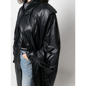 shoulder-pad oversized trench coat from SAINT LAURENT featuring jet black, storm flap, shimmer finish, epaulettes, shoulder pads, long collar, front button fastening, long wide sleeves, belted cuffs and ankle-length. Nylon cloak coat Size and Fit - This piece fits true to size. We recommend you get your regular size. Model is 1,75m / 5ft 8in wearing size 1 (NUM)