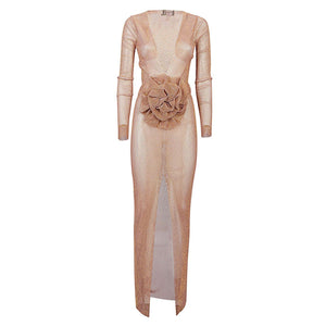 Long beige dress, long sleeves, large flower as a decoration in front, V -neck, front slit. Flower-applique long dress Size and Fit - This piece fits true to size. We recommend you get your regular size. Model is 1,75m / 5ft 8in wearing size UNI