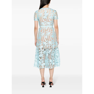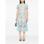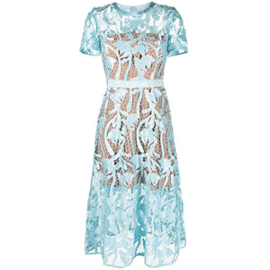 light blue guipure lace round neck concealed rear hook and zip fastening short sleeves fitted waistline belted waist flared skirt straight hem partial lining mid-calf length Lace midi dress Size and Fit - This piece fits true to size. We recommend you get your regular size. Model is 1,75m / 5ft 8in wearing size 8 (UK)