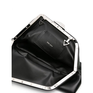 جلد خروف أسود، جسم غير متماثل، أحرف شعار فضية اللون، حزام كتف قابل للتعديل والفصل، قفل بزر كبس، حجرة رئيسية، فتحات بطاقات داخلية، أجزاء معدنية فضية اللون، المقاس والملاءمة - العرض 13.39 بوصة / 34 سم