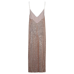 فستان طويل مزين بالترتر، وفتحة رقبة على شكل حرف V، وأشرطة رفيعة وظهر منخفض. المقاس والملاءمة - هذه القطعة تناسب المقاس الحقيقي. نوصيك بالحصول على مقاسك المعتاد. يبلغ طول العارضة 1.75 متر / 5 أقدام و8 بوصات وترتدي المقاس S