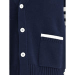 Thom Browne’s merino wool Cardigan is a classic revisited with iconic details and sartorial care. It features a V-neck, front button closure and two patch pockets with contrasting piping. The hem and cuffs are ribbed, while contrasting bands on the left sleeve and discreet side slits add a distinctive touch to the essential design.