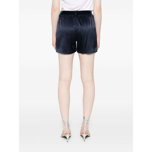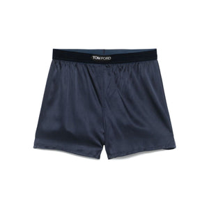 navy blue elasticated waistband logo waistband Silk shorts Size and Fit - This piece fits true to size. We recommend you get your regular size. Model is 1,75m / 5ft 8in wearing size S