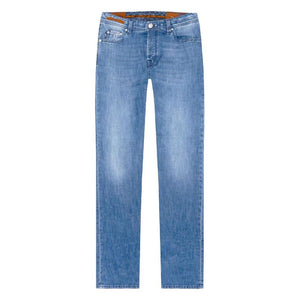 Elevate your denim game with the suave Tramarossa Michelangelo jeans. These Italian-crafted jeans offer a slight stretch for unparalleled comfort, all while showcasing a timeless faded blue hue that exudes casual elegance. Featuring a convenient zip and button fastening and a classic five-pocket design, these jeans are perfected with a smooth red leather patch that adds a dash of luxury to your wardrobe. Bold, contemporary, and effortlessly stylish, they’re a quintessential piece for the fashion-forward gent.