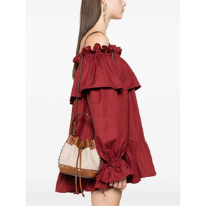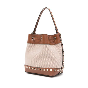 earth brown top drawstring fastening single studded top handle adjustable detachable shoulder strap mini check pattern Rockstud canvas bucket bag Size and Fit - Width 24 cm Height 19 cm Depth 11 cm