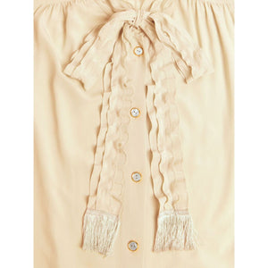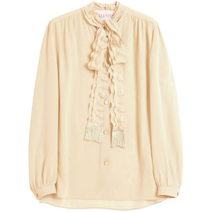 beige silk front button fastening pussy-bow collar ruffled detailing long puff sleeves buttoned cuffs curved hem Crepe de chine silk blouse Size and Fit - This piece fits true to size. We recommend you get your regular size. Model is 1,75m / 5ft 8in wearing size 40 (IT)