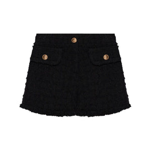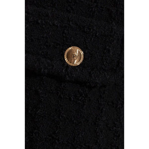 سترة من مزيج صوف تويد أسود مع أزرار مزخرفة وجيبان جانبيان متداخلان وأزرار ذهبية اللون منقوشة وسحاب مخفي وقفل بأزرار بطول الفخذ المقاس والملاءمة - هذه القطعة تناسب المقاس الحقيقي. نوصيك بالحصول على مقاسك المعتاد. يبلغ طول العارضة 1.75 متر / 5 أقدام و8 بوصات وترتدي المقاس 40 (إيطاليا)