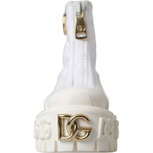حذاء كاحل رائع جديد تمامًا مع العلامات، أصلي بنسبة 100% من دولتشي آند غابانا، مصنوع من الجلد والمطاط باللون الأبيض، يتميز بلوحة شعار ذهبية اللون، وسحاب أمامي للإغلاق، وعلامة سحب عند الكعب ونعل مطاطي سميك.