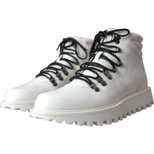 علامة تجارية جديدة رائعة مع العلامات، حذاء Dolce & Gabbana الأصلي بنسبة 100% للرحلات باللون الأبيض Vulcano ومصنوع من الجلد ويتميز بمقدمة قدم مستديرة ونعل مطاطي مضلع وغلق برباط أمامي وطول حتى الكاحل وتفاصيل الشعار الجانبي والخلفي.