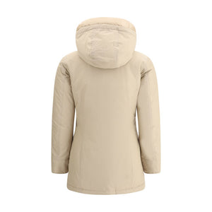Arctic parka Jacket by Woolrich is made of durable Ramar Cloth fabric, treated with Teflon coating to provide protection from water and wind. Featuring a front zipper and concealed button closure, it has a protective hood, Velcro closure with logo on the collar and slanted flap pockets. Ribbed inner cuffs provide additional comfort and insulation, making the garment ideal for colder days.