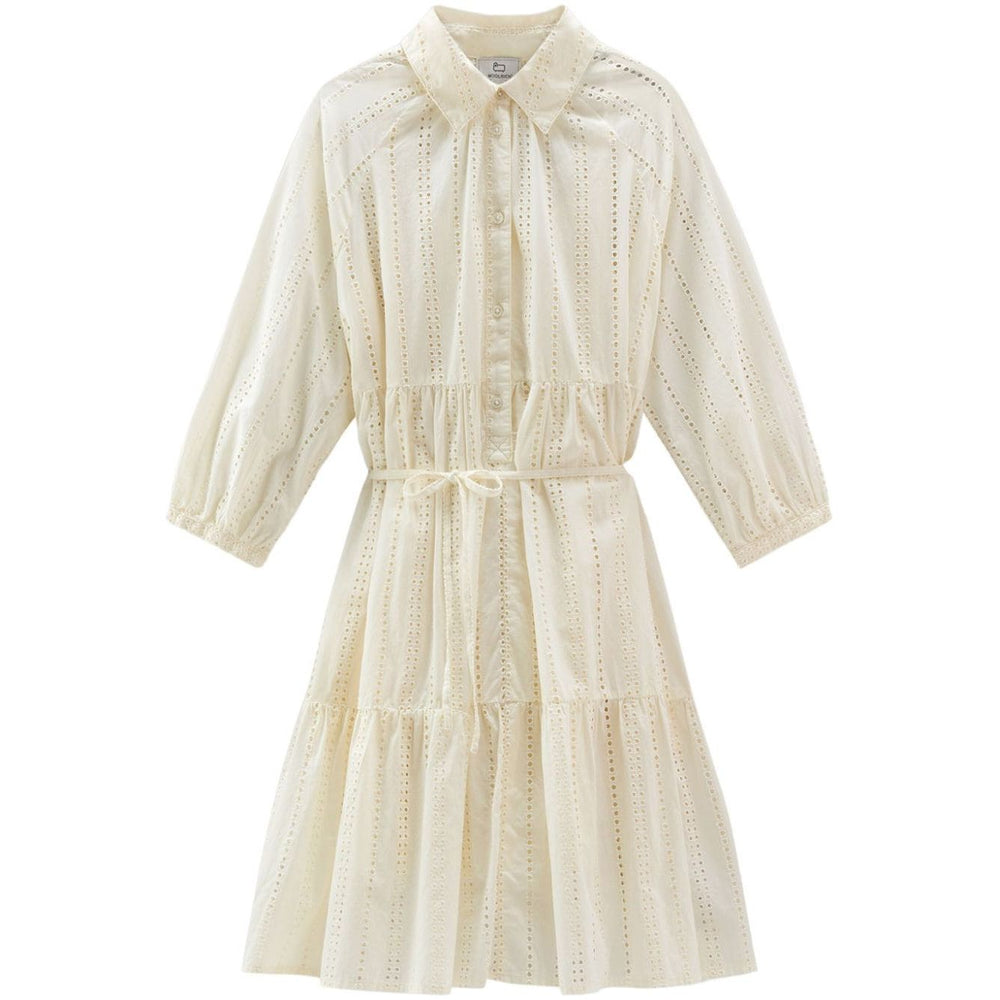 ecru cotton broderie anglaise spread collar front button placket three-quarter length puff sleeves tied waist tiered skirt straight hem above-knee length Cotton shirt dress Size and Fit - This piece fits true to size. We recommend you get your regular size. Model is 1,75m / 5ft 8in wearing size S