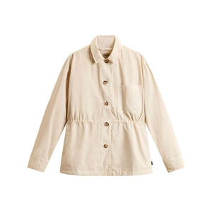 light beige front button fastening chest patch pocket elasticated waistband buttoned cuffs Cotton shirt jacket Size and Fit - This piece fits true to size. We recommend you get your regular size. Model is 1,75m / 5ft 8in wearing size S