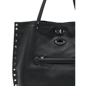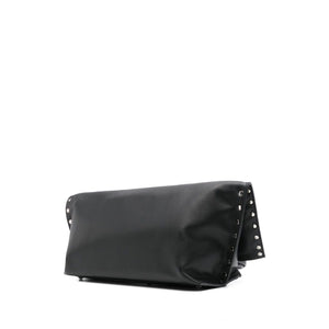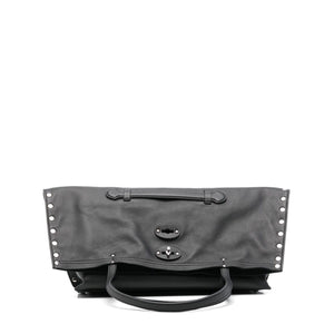 black foldover top turn-clasp fastening two flat top handles metal feet A'Spasso medium leather handbag Size and Fit - Width 13,78 in / 35 cm