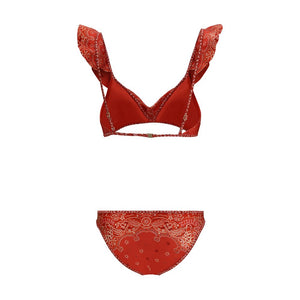Zimmerman’s Lucky Frill Swimsuit is an item with bohemian and playful appeal, perfect for those seeking a unique and feminine look. The bold and colorful bandana pattern immediately catches the eye, while the hook-and-eye back closure offers a secure and comfortable fit. The ruffle-enriched straps add a touch of romance and movement, giving the swimsuit a lively yet delicate personality.