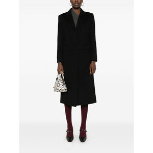 black virgin wool front button fastening peak lapels shoulder pads long sleeves buttoned cuffs chest welt pocket two side flap pockets central rear vent logo-jacquard lining straight hem mid-length Wool single-breasted coat Size and Fit - This piece fits true to size. We recommend you get your regular size. Model is 1,75m / 5ft 8in wearing size 40 (IT)