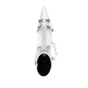 Cagole 90mm metallic ankle boots from BALENCIAGA featuring silver-tone, calf leather, metallic finish, silver-tone stud detailing, zip detail, side zip fastening, ankle-length, pointed toe and high stiletto heel. Conscious: We've partnered with Good On You – an ethical agency that rates how sustainably brands perform. This item comes from a brand that performs well in relation to their impact on the planet.. Le Cagole leather boots Size and Fit - Heel 3,5 in / 9 cm
