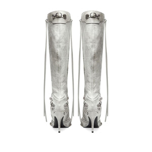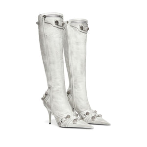 Cagole point-toe boots from BALENCIAGA featuring optical white, lambskin, pointed toe, stud embellishment, zip details, silver-tone hardware and stiletto heel. Le Cagole leather boots Size and Fit - Heel 9 cm