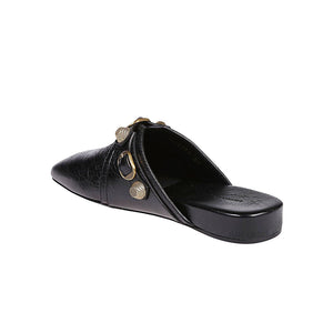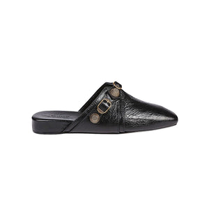 Nero, pelle di agnello, pelle, effetto stropicciato, chiusura con fibbia, dettaglio con borchie color argento, punta quadrata, apertura sul retro, design slip-on, soletta in pelle con logo e suola piatta. Cosy Cagole leather slippers Size and Fit - Heel 1 in / 2,5 cm
