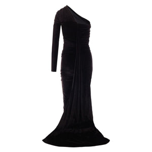 black one-shoulder gathered detailing draped detailing asymmetric neck single long sleeve asymmetric hem maxi Velvet long dress