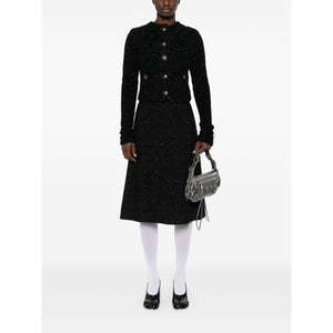 black cotton blend bouclé construction metallic threading crew neck long sleeves two front patch pockets logo-embossed buttons cropped full lining straight hem front button fastening Bouclé cropped jacket Size and Fit - BUST: 68.0 Centimetres. LENGTH: 44.0 Centimetres. WAIST: 64.0 Centimetres. SLEEVE LENGTH: 78.0 Centimetres. Shoulder Width: 36.0 Centimetres.