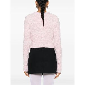 blush pink cotton blend tweed round neck long sleeves two side button-fastening pockets logo-embossed buttons front button fastening straight hem Bouclé cropped jacket Size and Fit - SLEEVE LENGTH: 78.0 Centimetres. LENGTH: 44.0 Centimetres. WAIST: 64.0 Centimetres. BUST: 68.0 Centimetres. Shoulder Width: 36.0 Centimetres.