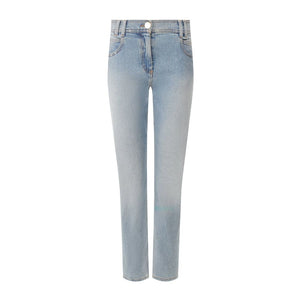 Exude confidence with every step in these iconic Balmain jeans, crafted for the trendsetter. Washed in a chic blue hue, these regular-fit jeans boast a classic six-pocket design, secured by a traditional button and zipper fly. The subtle embroidered logo on the back pocket adds an exclusive touch of luxury, making these jeans a wardrobe essential for the fashion-forward. A statement of effortless style and comfort, thanks to the perfect blend of cotton and elastane.