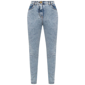 Elevate your denim game with the Balmain high-waist jeans – a garment that oozes sophistication and trendsetting style. Crafted for the fashion-forward woman, these slim-fit jeans boast a light faded blue hue that’s versatile and chic. The detailing is quintessentially Balmain; featuring gold metal buttons and rivets that add a touch of luxury, while the gold logo plaque on the back cements your elite status. Perfect for a bold brunch or a night out with flair, these jeans are a statement piece waiting to shine in your wardrobe.